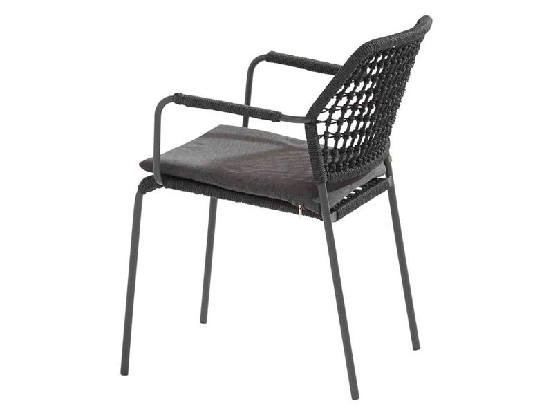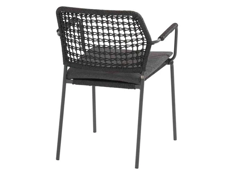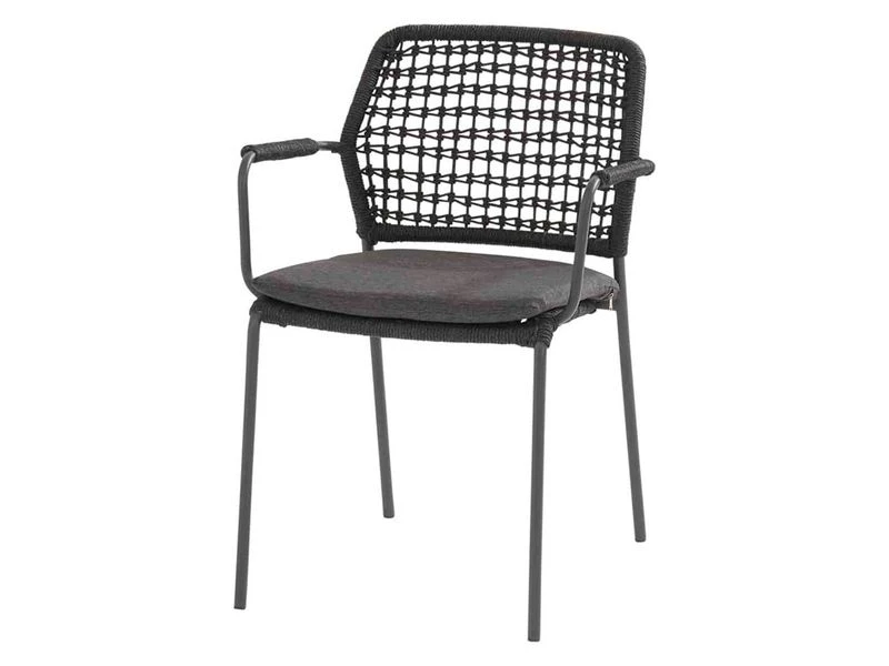 Deze stoel is uitgevoerd in de kleur antraciet. Het rope materiaal is weerbestendig en in een blok-patroon geknoopt. Het rope komt op subtiele wijze weer terug in de armleuningen.